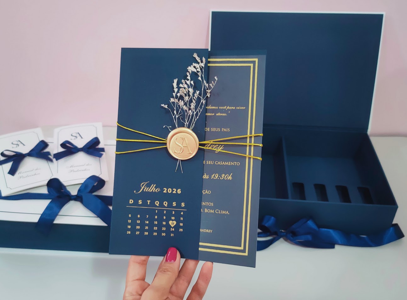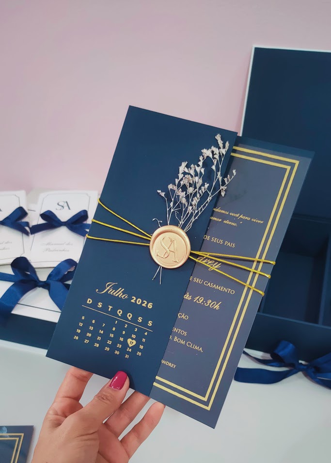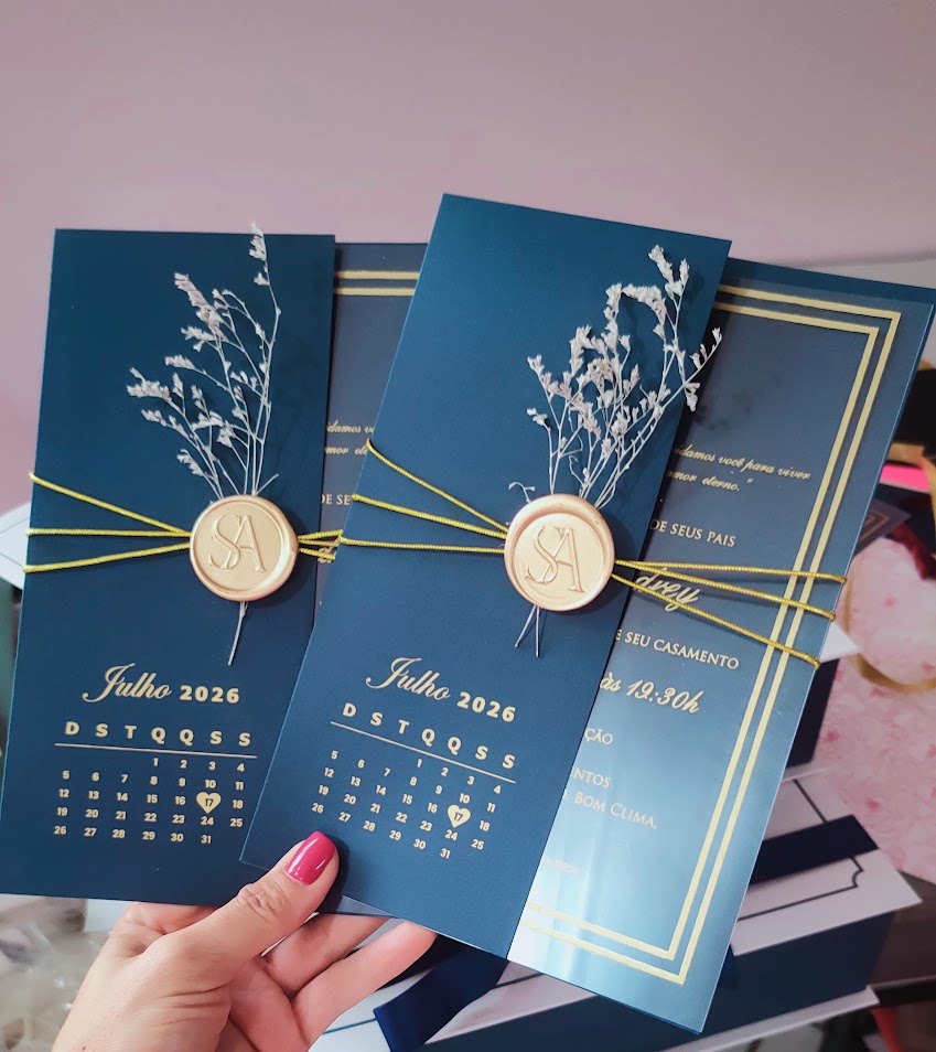 Impressão interna: Silk Dourado (cor pode ser alterada) Fechamento: Laço em fio dourado com lacre de cera personalizado e sempre viva.